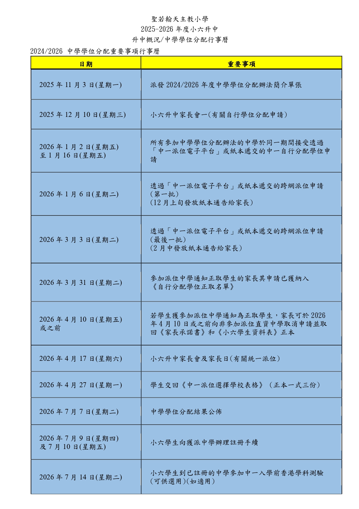 中學學位分配行事曆